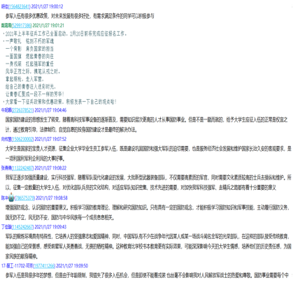 通过本次线上会议,同学们理解了相关政策,知晓了参军归来的同学在考研和就业上更占优势,为个人发展提供了更多机会,同时部队的锻炼也让他们在学习、生活中会更加自律和主动,绿色军营的经历将是他们一生的宝贵财富,他们积极参军入伍,磨炼意志,守护家园的意愿更加强烈。